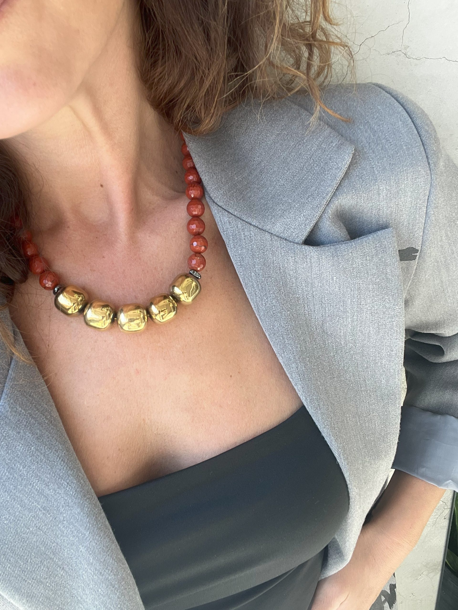Χρυσόλιθος και αιματίτης σε ενα ιδιαίτερο κολιέ που μπορεί να φορεθεί όλες τις ώρες.