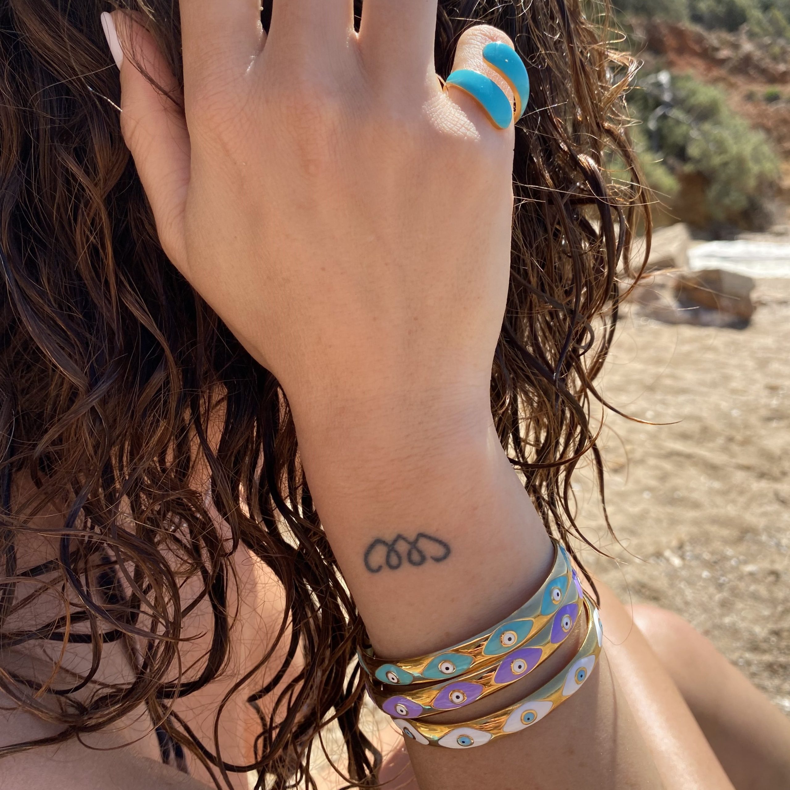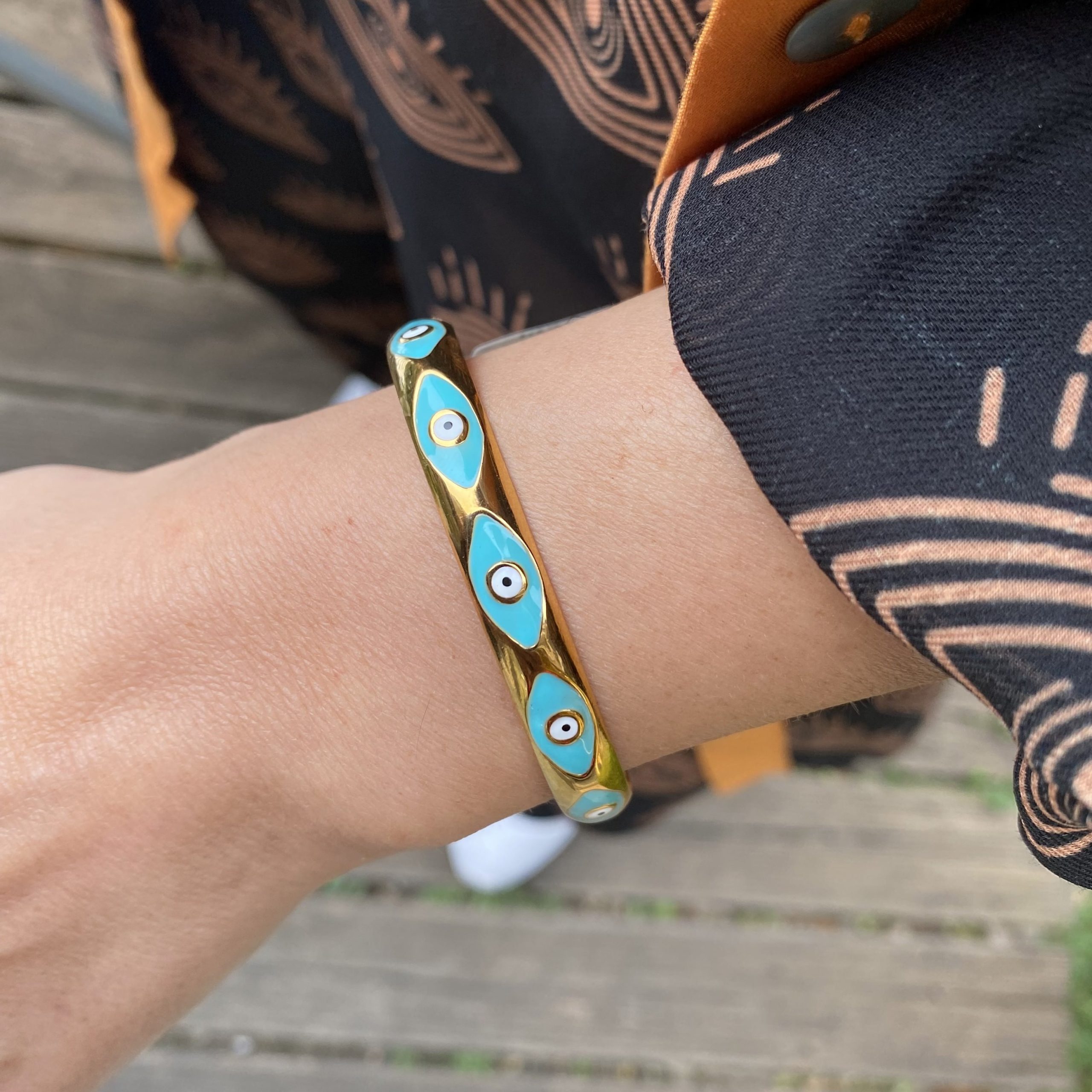 Ατσάλινο βραχιόλι επιχρυσωμένο με ματάκια απο σμάλτο σε τιρκουάζ χρώμα.