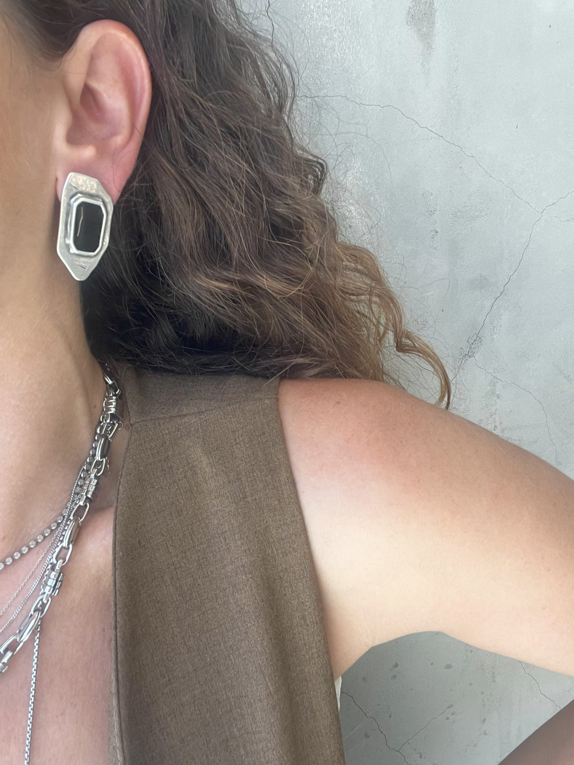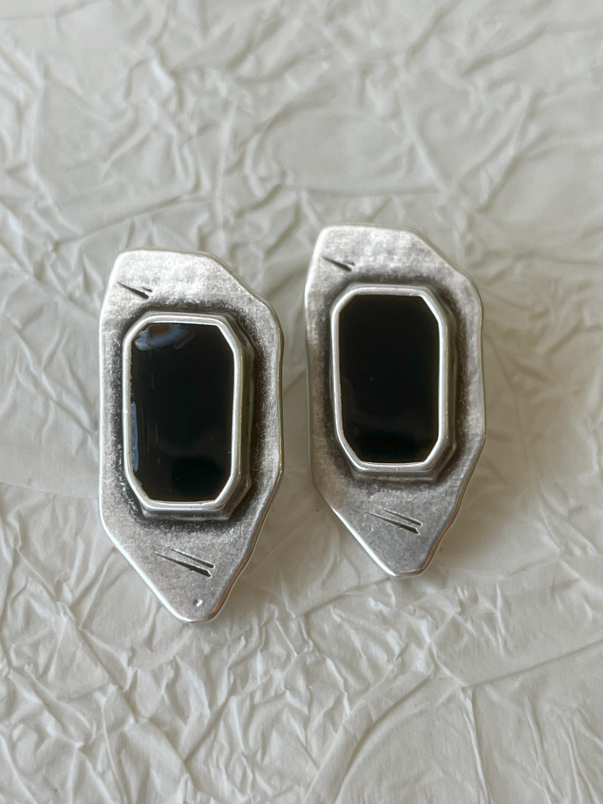 Χειροποίητο σκουλαρίκι απο ορείχαλκο με υγρο γυαλί σε μαύρο χρώμα. Αντικέ ασημί επιμετάλλωση.