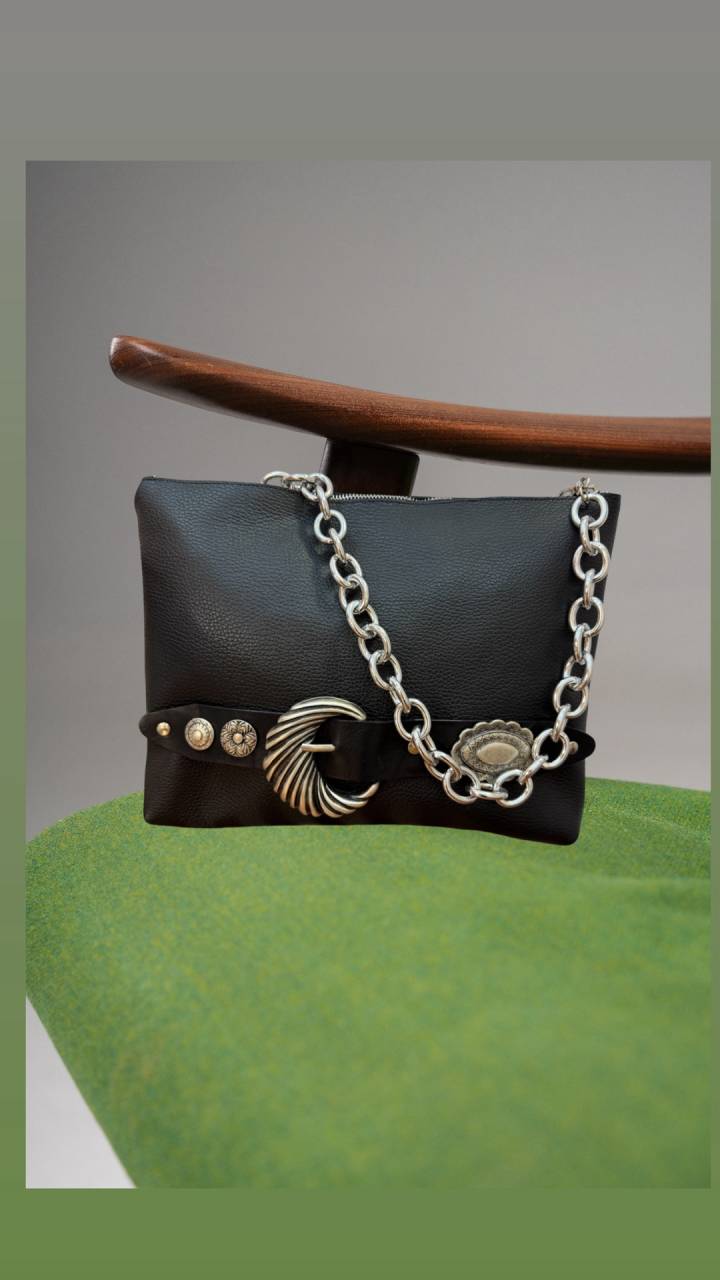 Δερμάτινη χειροποίητη τσάντα με μεταλλικά αξεσουάρ.