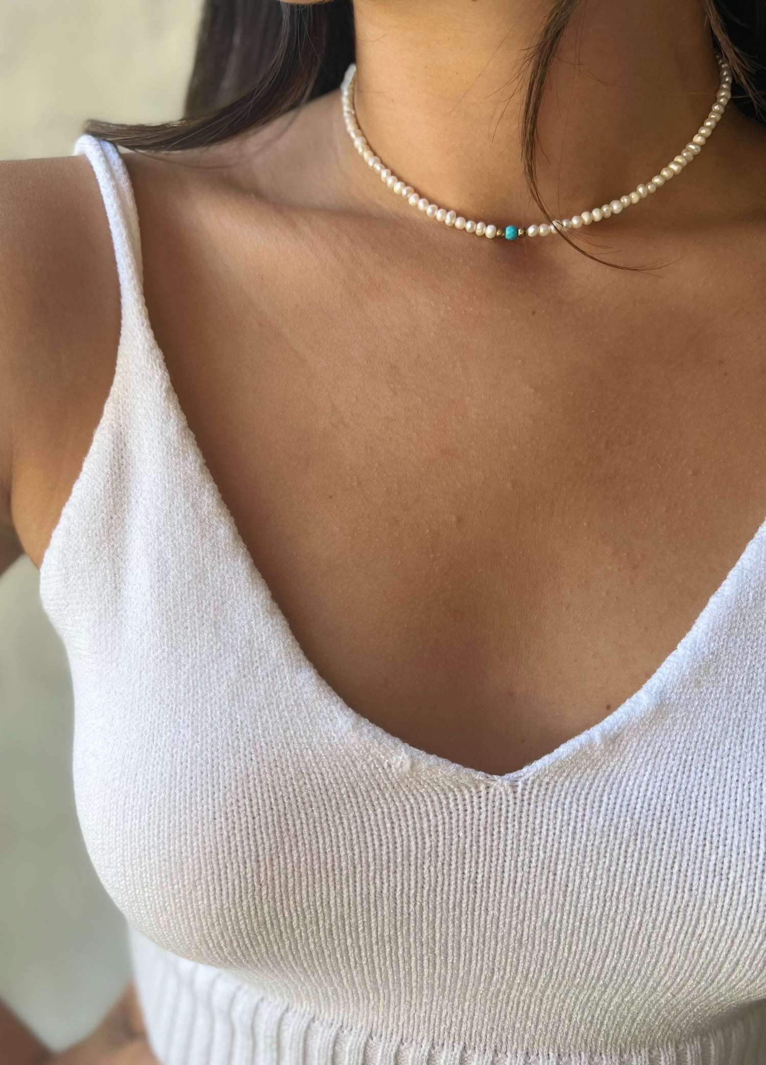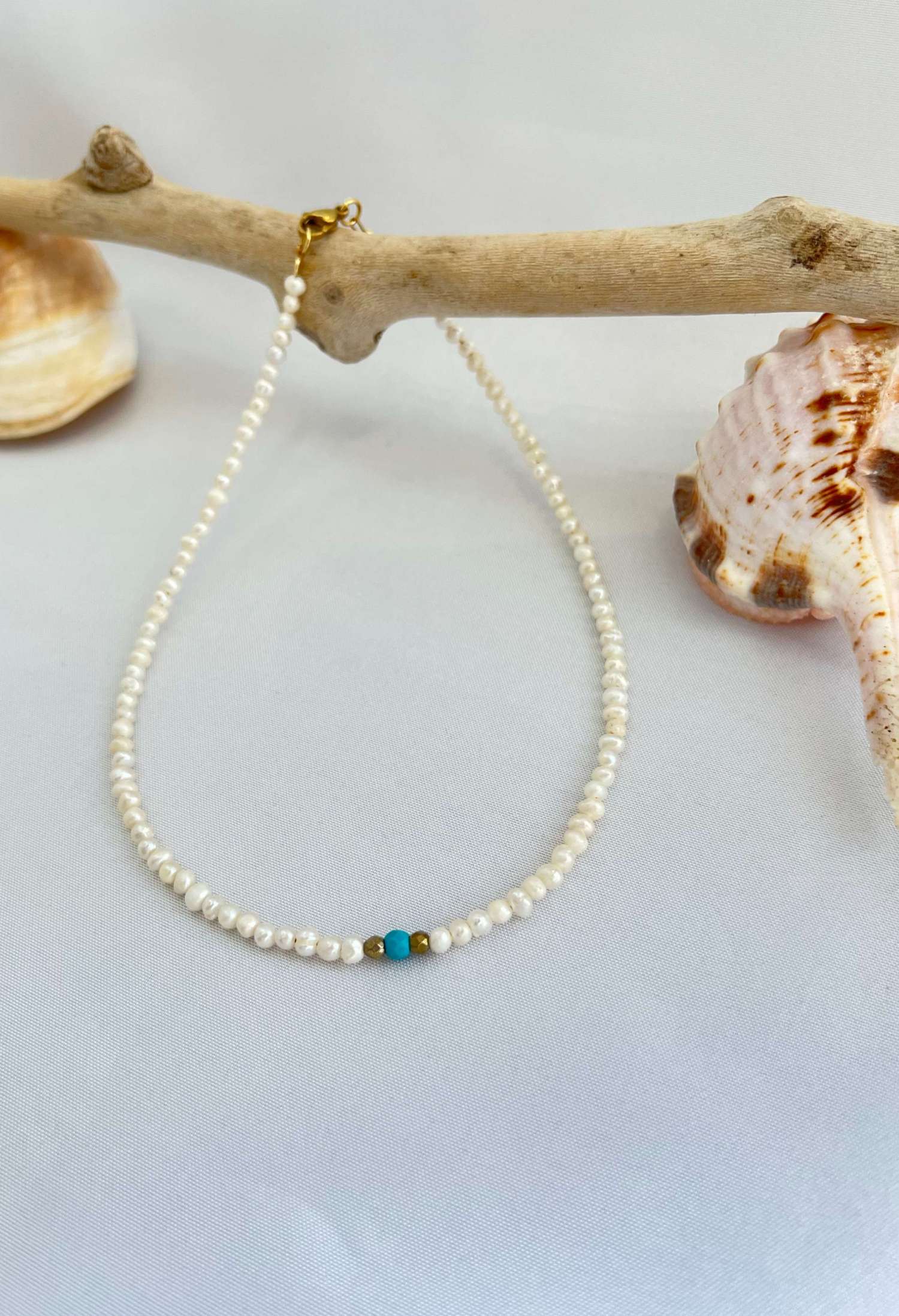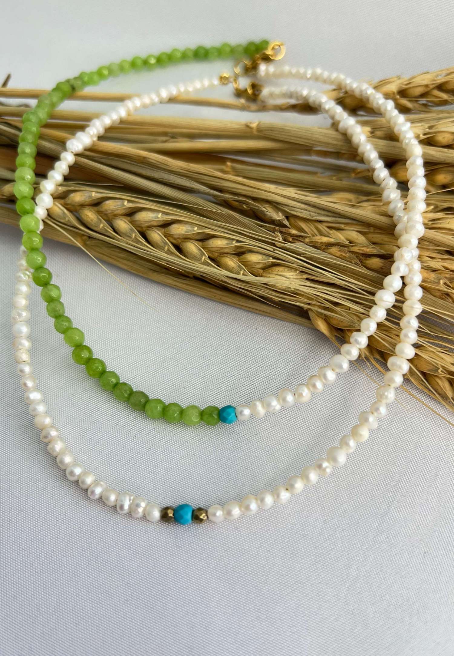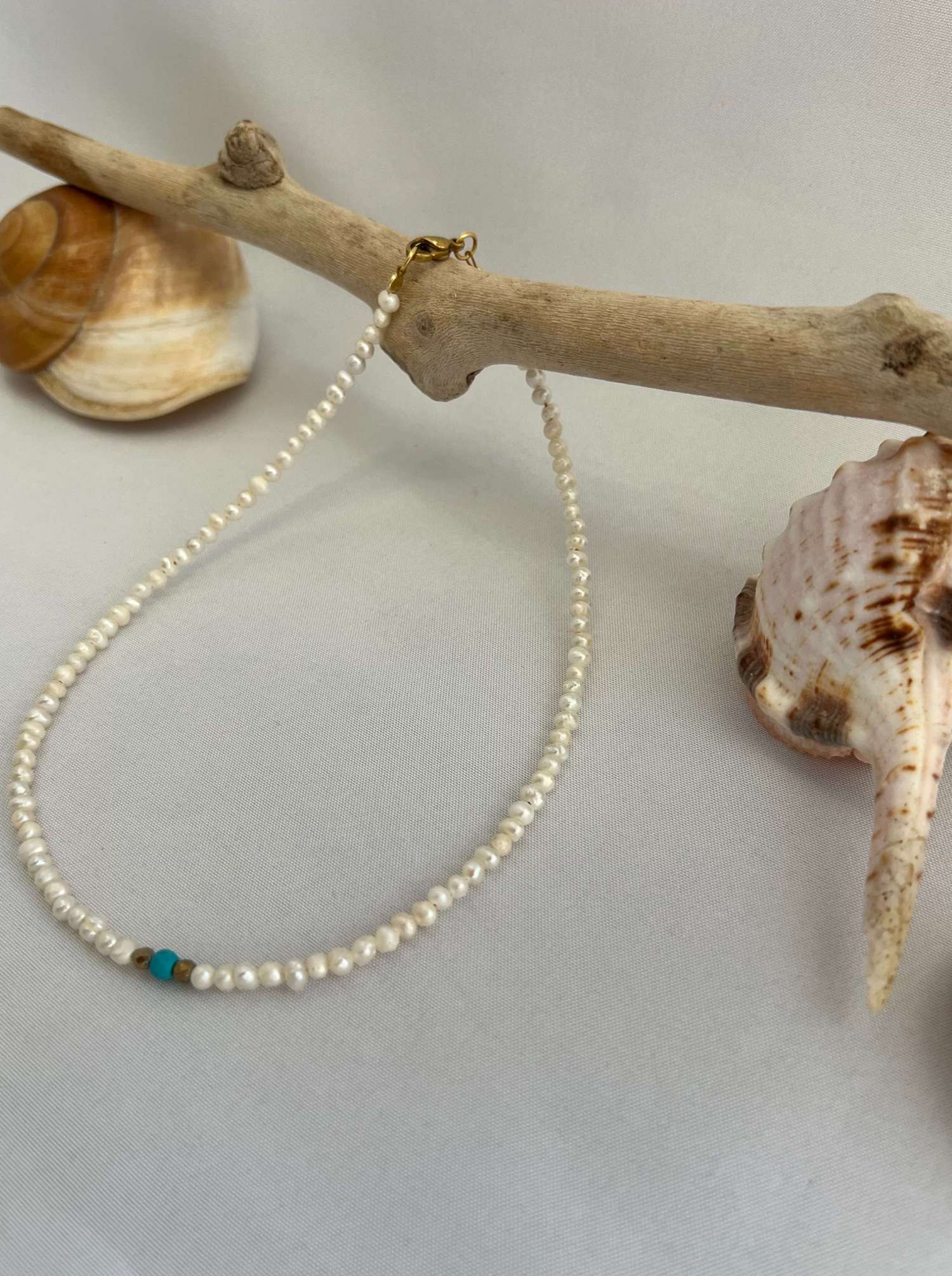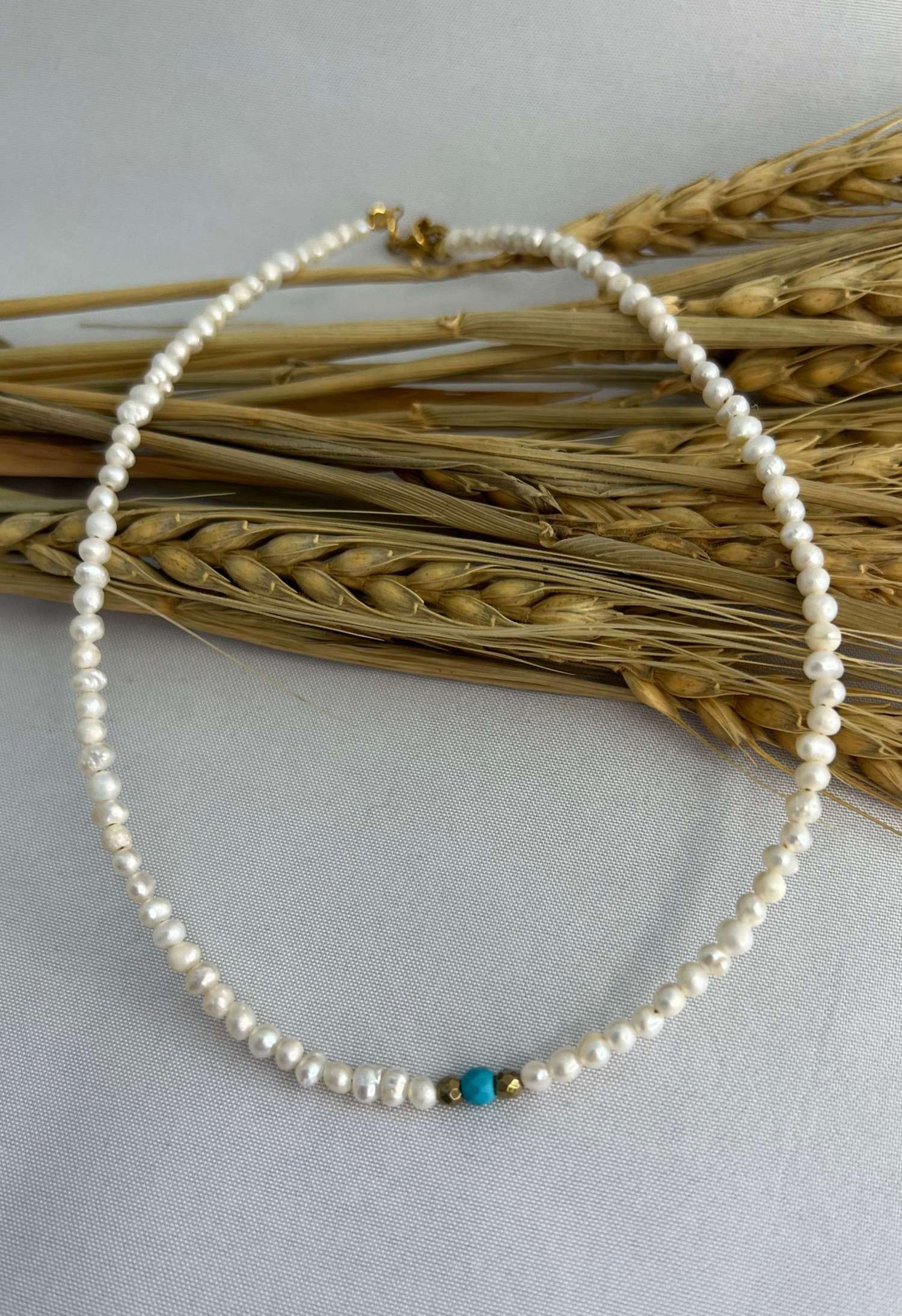 Χειροποίητο κολιέ με φυσικές πέρλες, αιματίτη και τιρκουάζ. Κούμπωμα από ατσάλι. Μήκος: 40 εκ.
