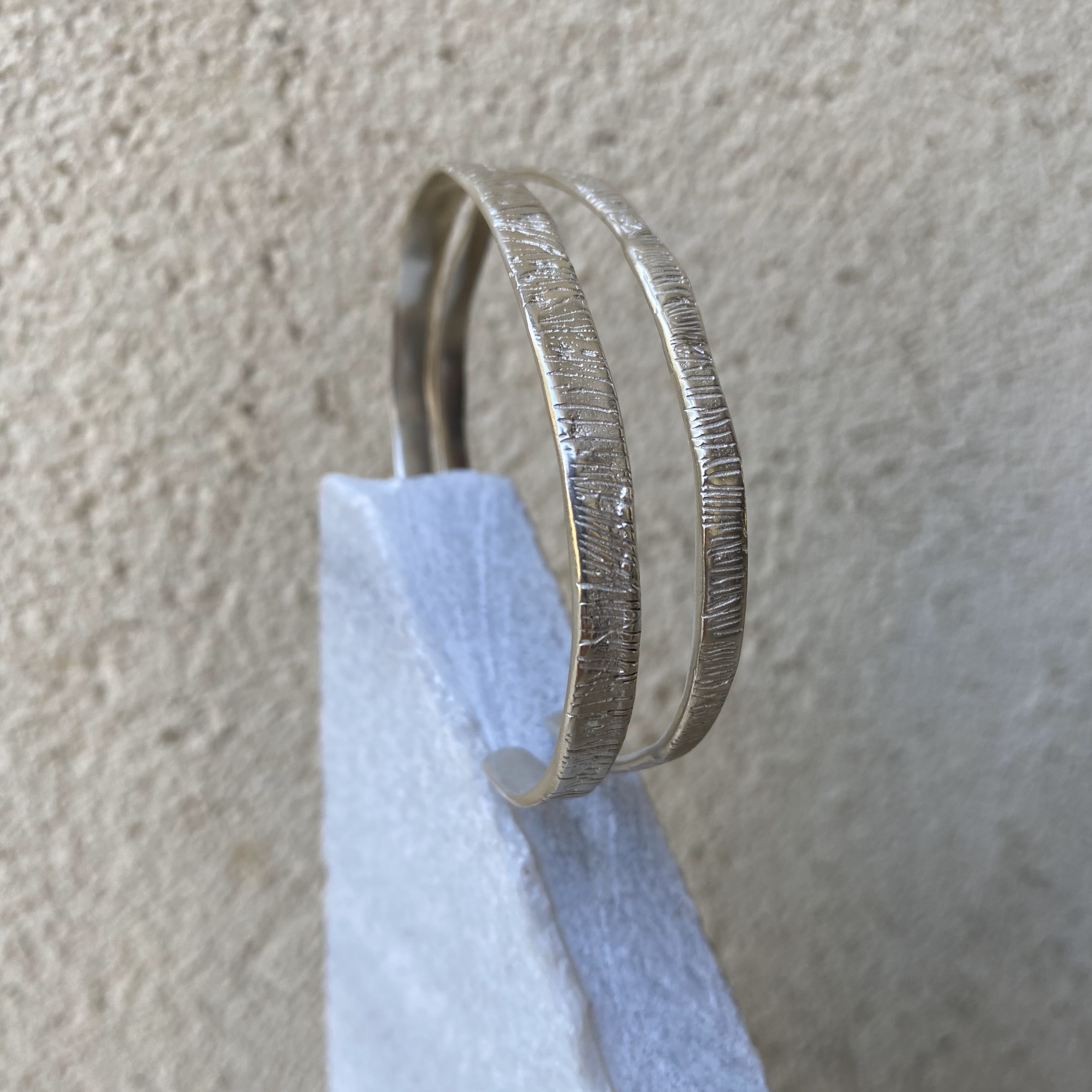 Χειροποίητο μεταλλικό βραχιόλι απο ασήμι 925* επαργυρωμένο με γραμμές χαραγμένες στην επιφάνεια του.