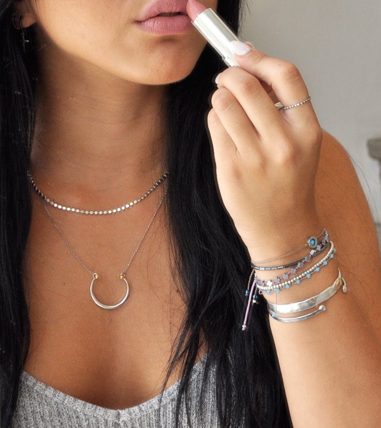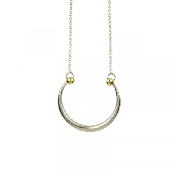 Χειροποίητο ασημένιο (925) κολιέ σε σχήμα μισοφέγγαρο με βάση επάργυρη και επίχρυσα μπούλ. Επιμετάλλωση double 18Κ χρυσό και παλλαδιούχο υπόστρωμα. Μήκος αλυσίδας επάργυρης 25cm.