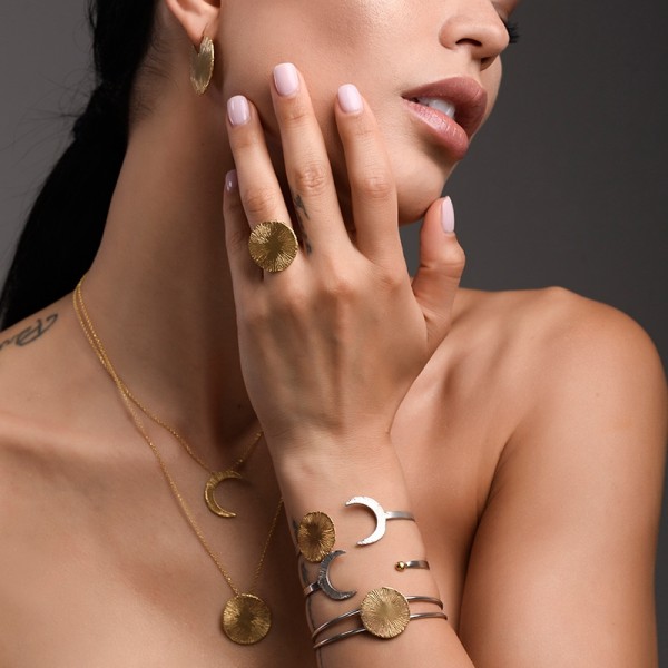 Χειροποίητο ασημένιο (925) κολιέ σε ιδιαίτερο σχήμα με ανάγλυφες ραβδώσεις, παλλαδιούχο υπόστρωμα με επιμετάλλωση double 18Κ χρυσό. Διάμετρο 2cm, αλυσίδα επίχρυση 45cm.