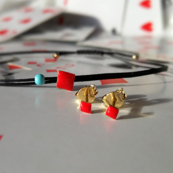 Χειροποίητο καρφωτό σκουλαρίκι από ασήμι επιχρυσωμένο και σμάλτο σε σχέδια από τραπουλόχαρτα.