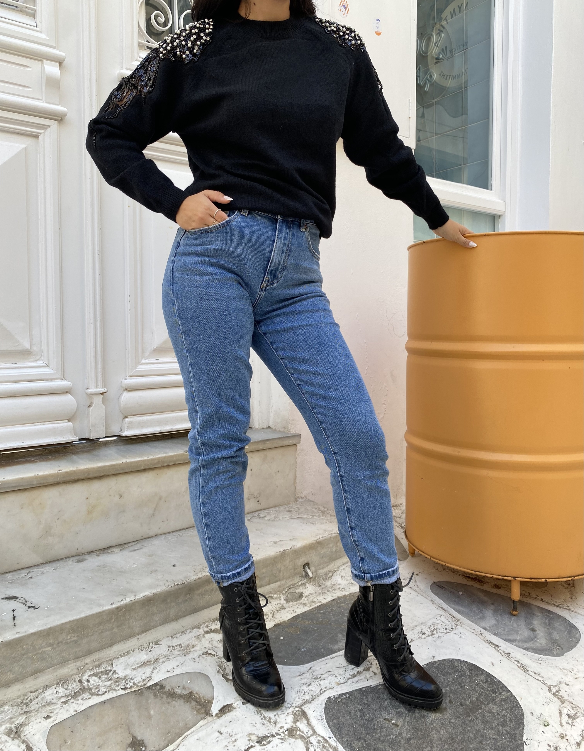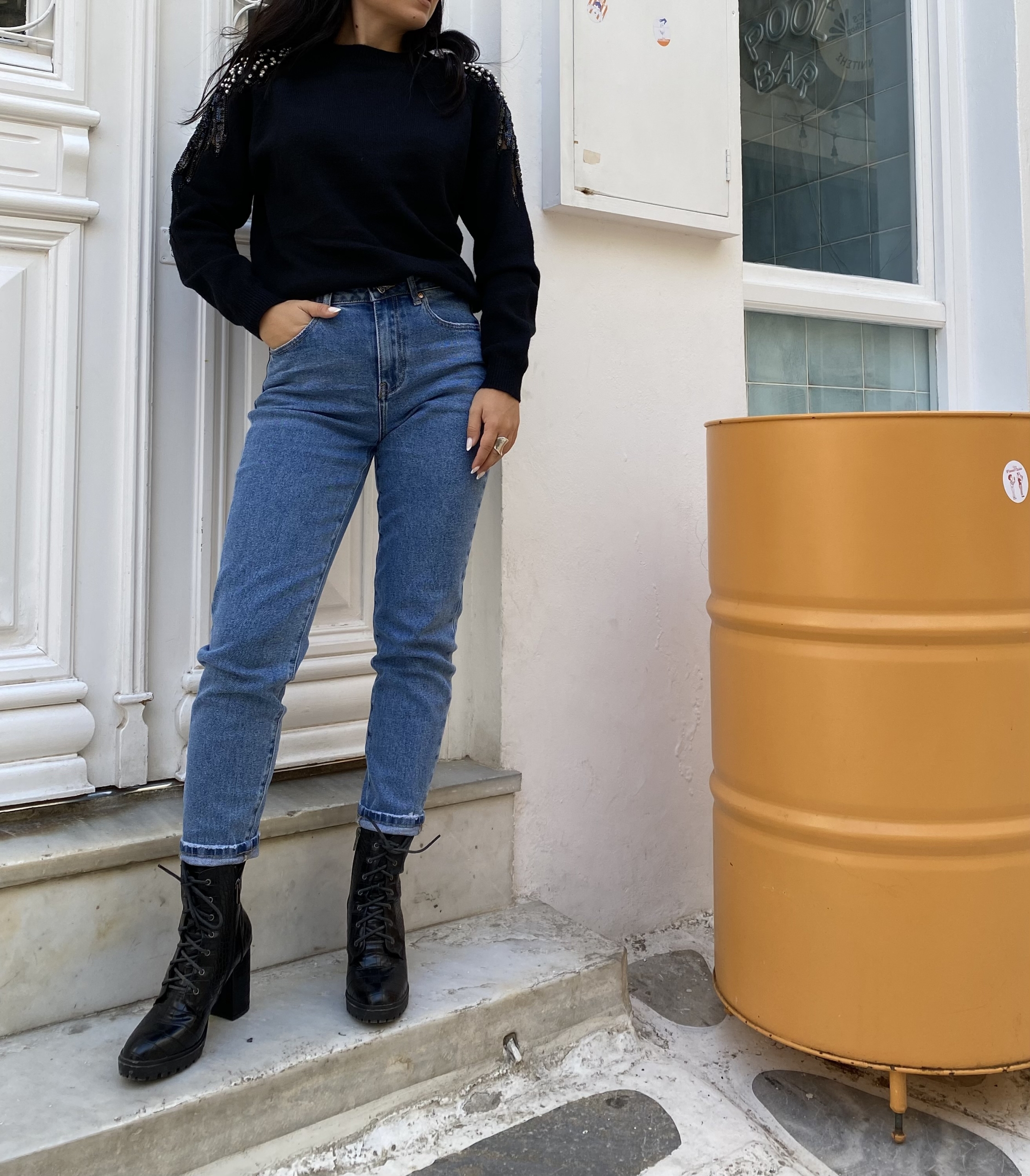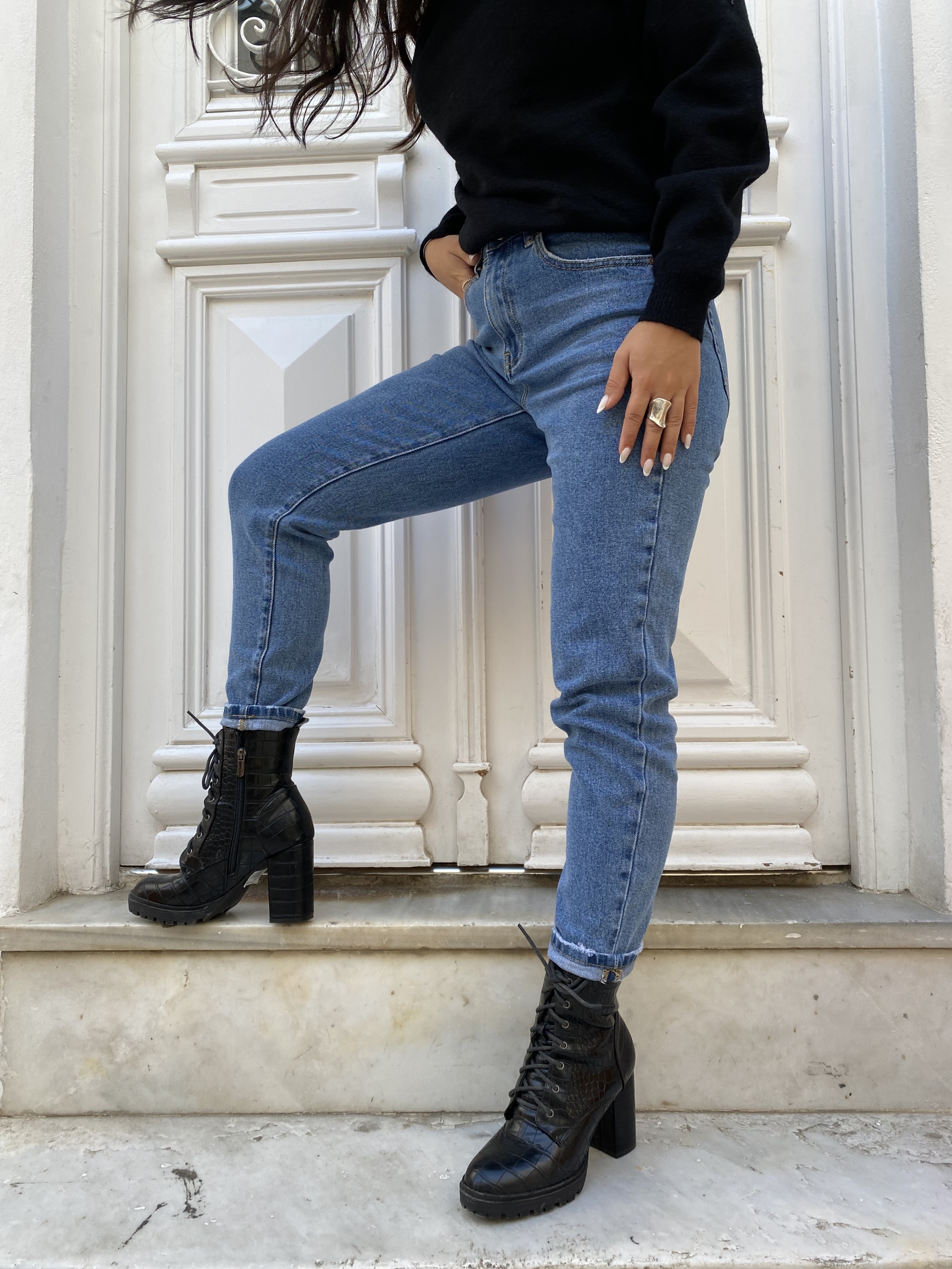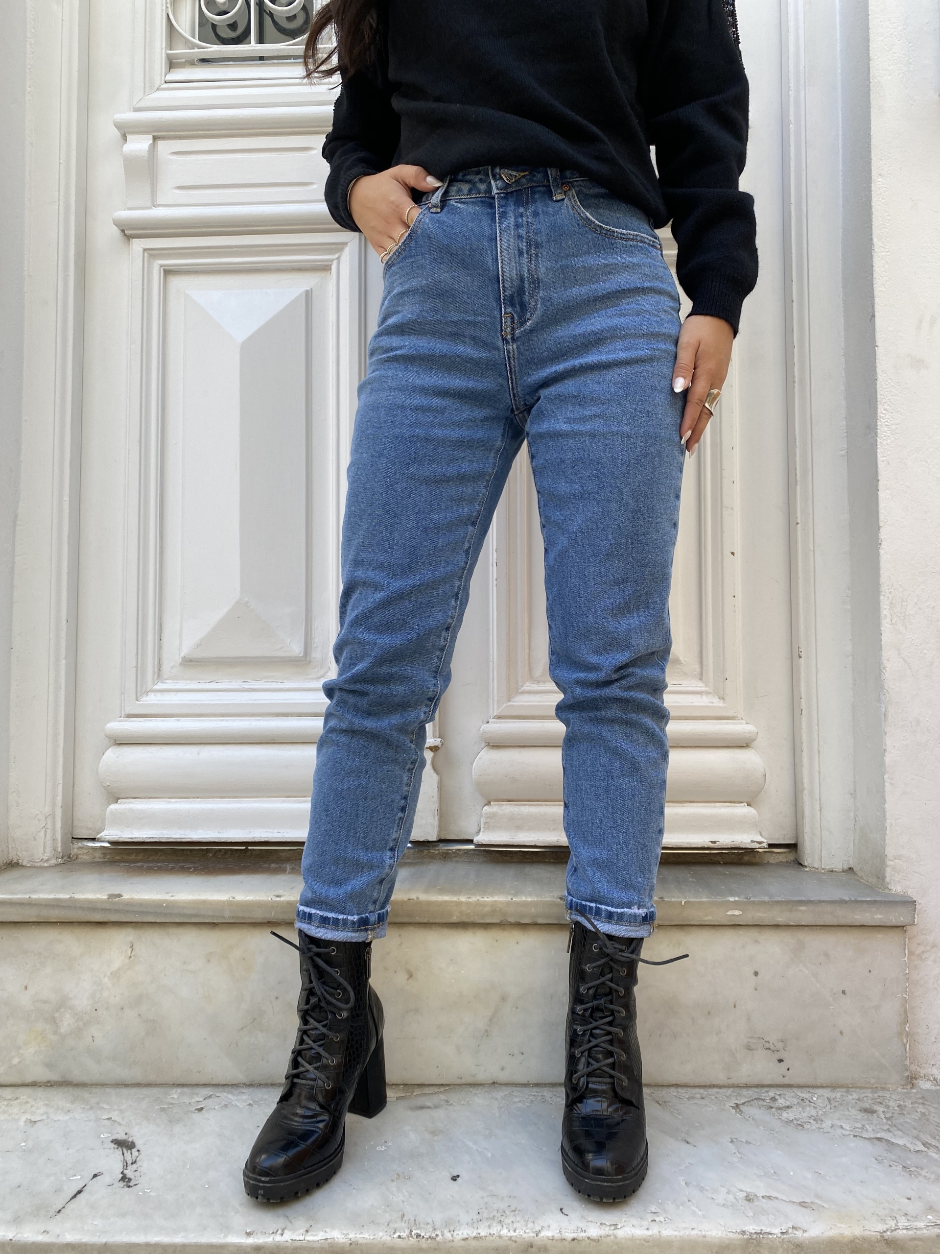 Ψηλόμεσο τζιν παντελόνι με πέντε τσέπες.Κλείσιμο μπροστά με φερμουάρ και με μεταλλικό κουμπί.