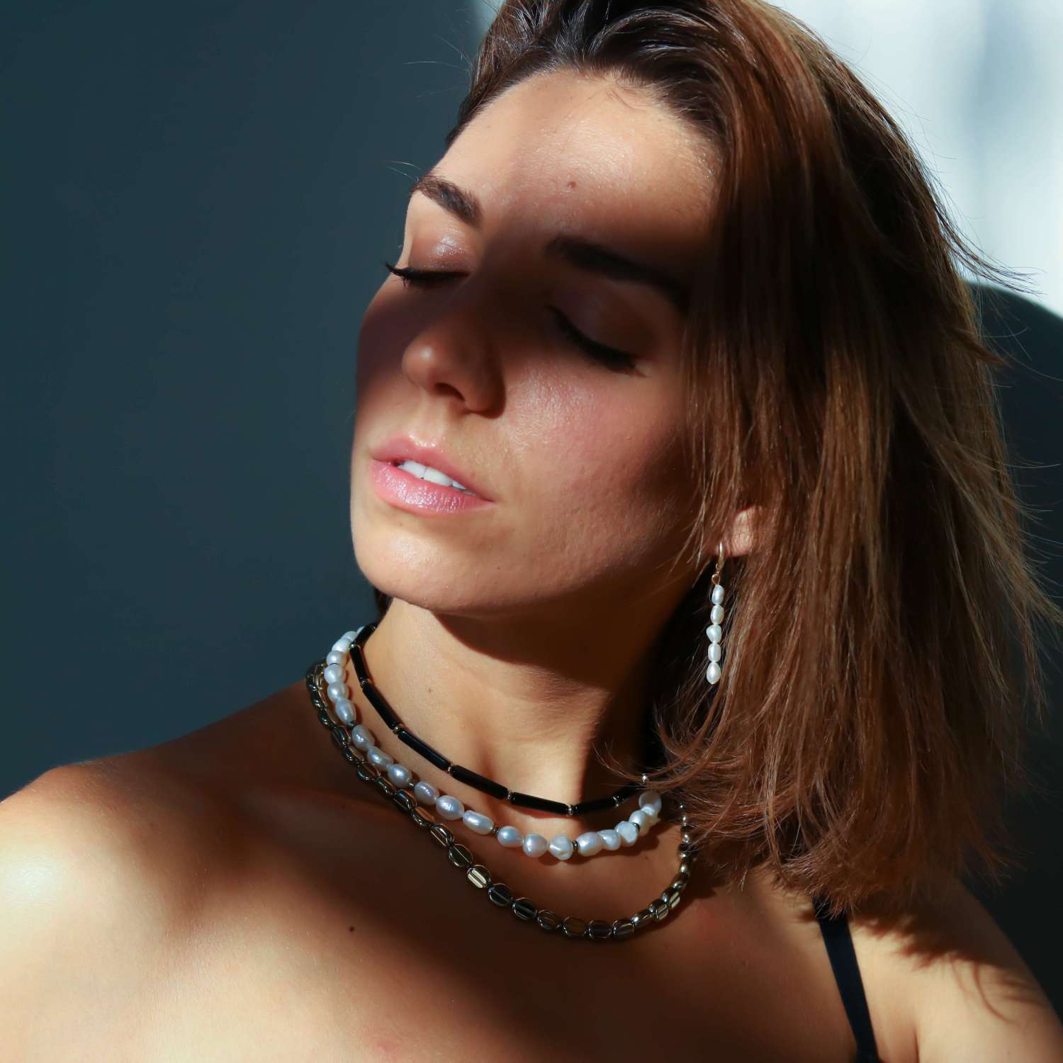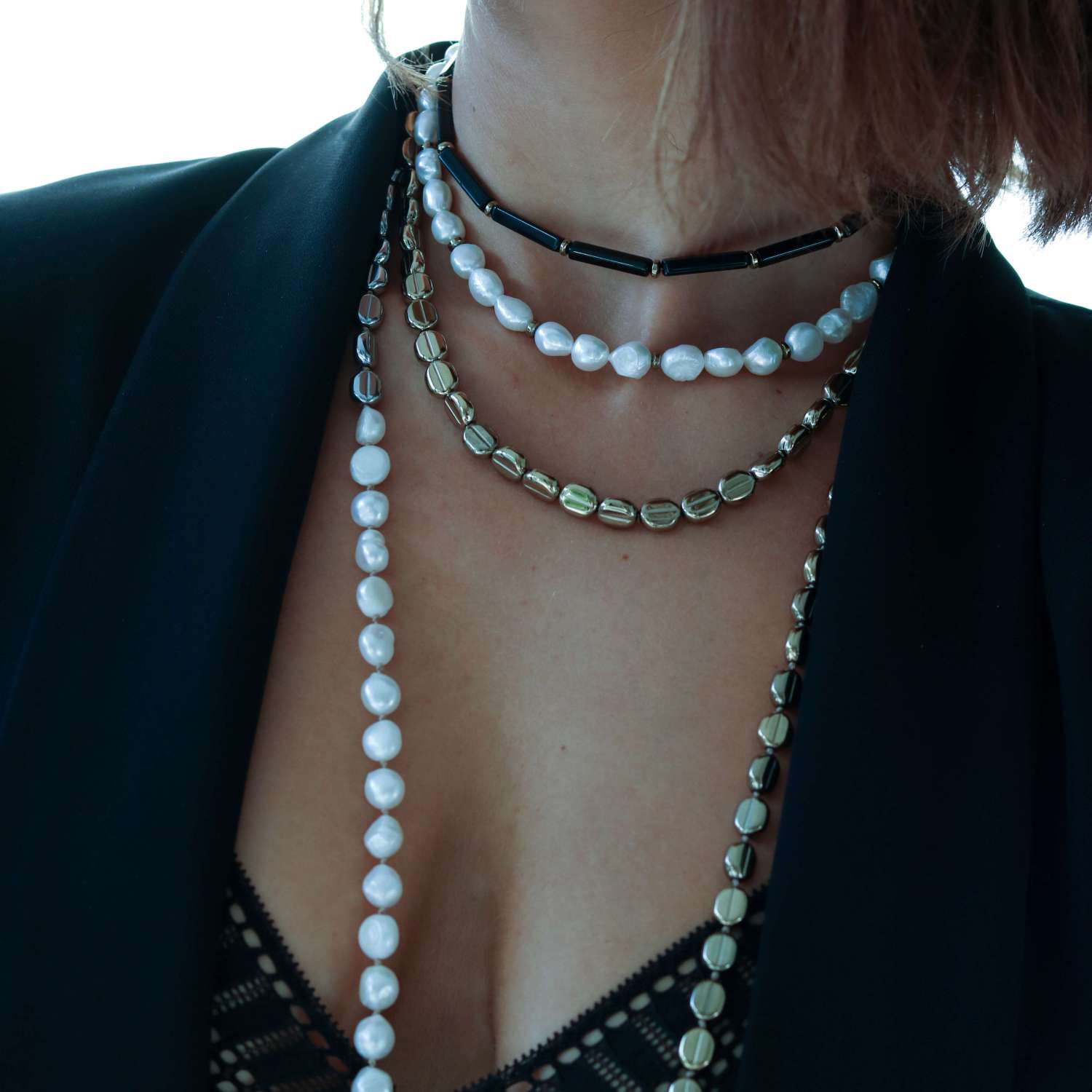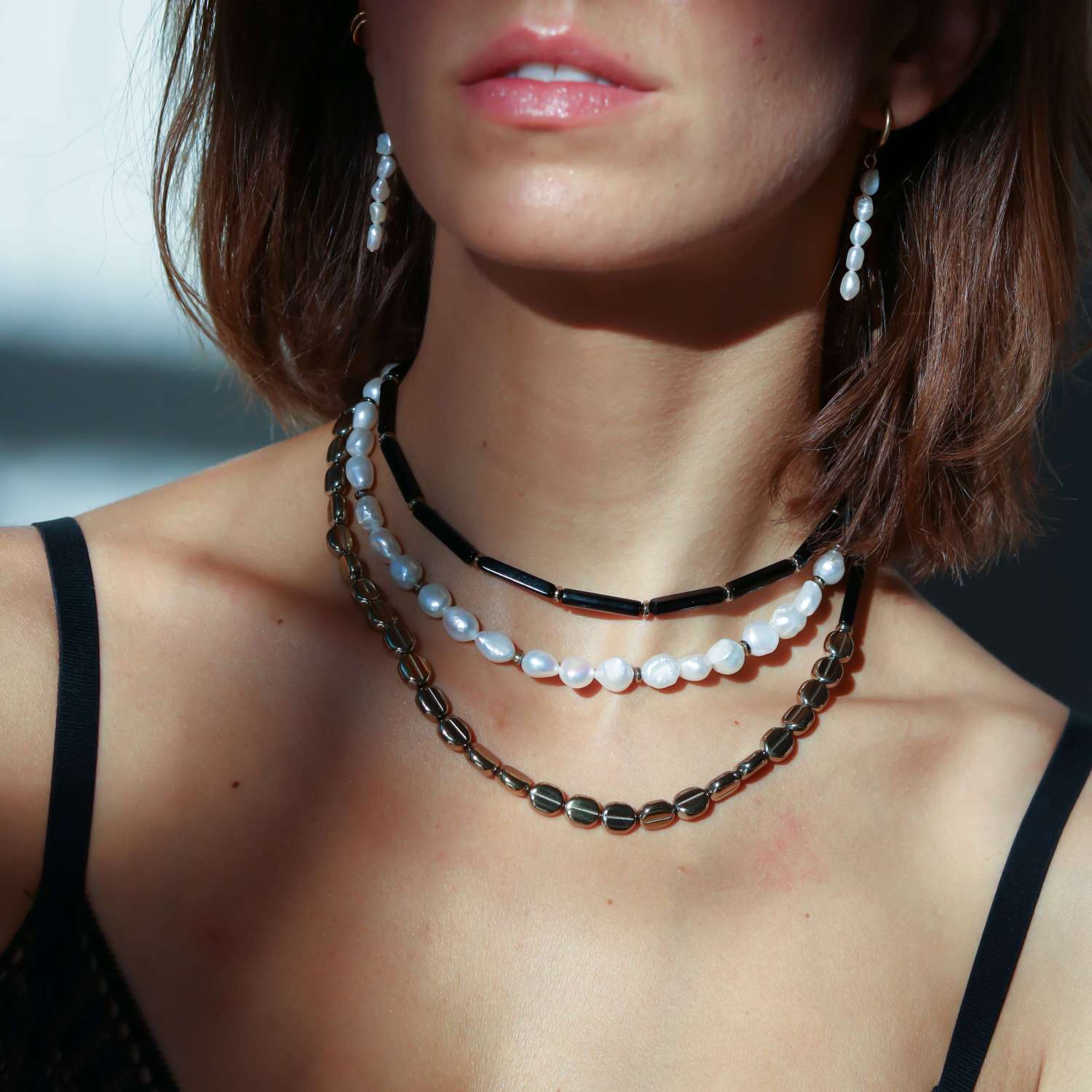 Triple necklace with black glass, natural pearls and hematite. Steel clasp.Τριπλό κολιέ με σειρά από μαύρο γυαλί, πέρλα και αιματίτη. Κούμπωμα από ατσάλι.