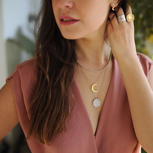 Χειροποίητο ασημένιο (925) κολιέ σε σχήμα μισοφέγγαρο, με επιμετάλλωση επίχρυση. Μήκος αλυσίδας 40cm.