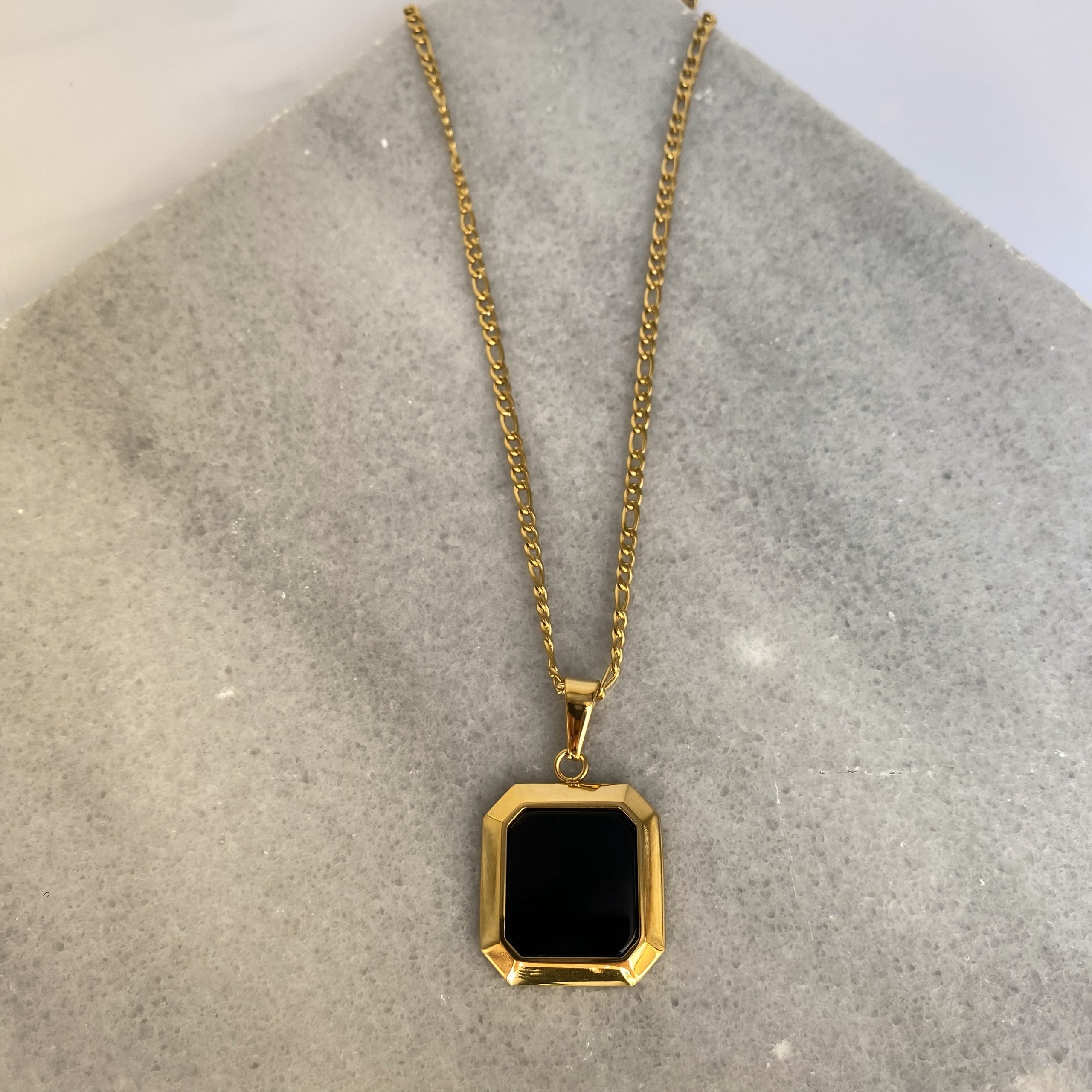 Κολιέ unisex με ατσάλινη αλυσίδα, επιχρυσωμένη και κρεμαστό στοιχείο με πέτρα όνυχα.