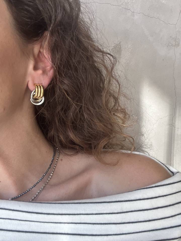 Handmade silver 925 stud earrings. Sold as a pair. Diameter: 2 cm. Χειροποίητο ασημένιο (925) σκουλαρίκι καρφωτό σε ιδιαίτερο σχήμα με ανάγλυφες ραβδώσεις, παλλαδιούχο υπόστρωμα και λευκή υποροδίωση σε ζευγάρι. Διάμετρος: 2 cm.