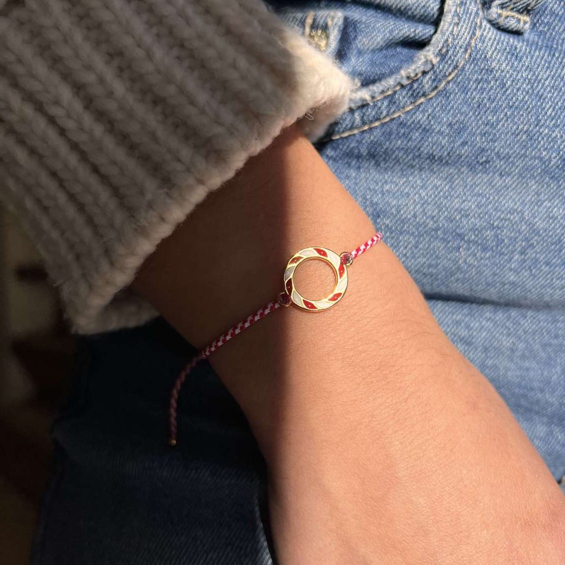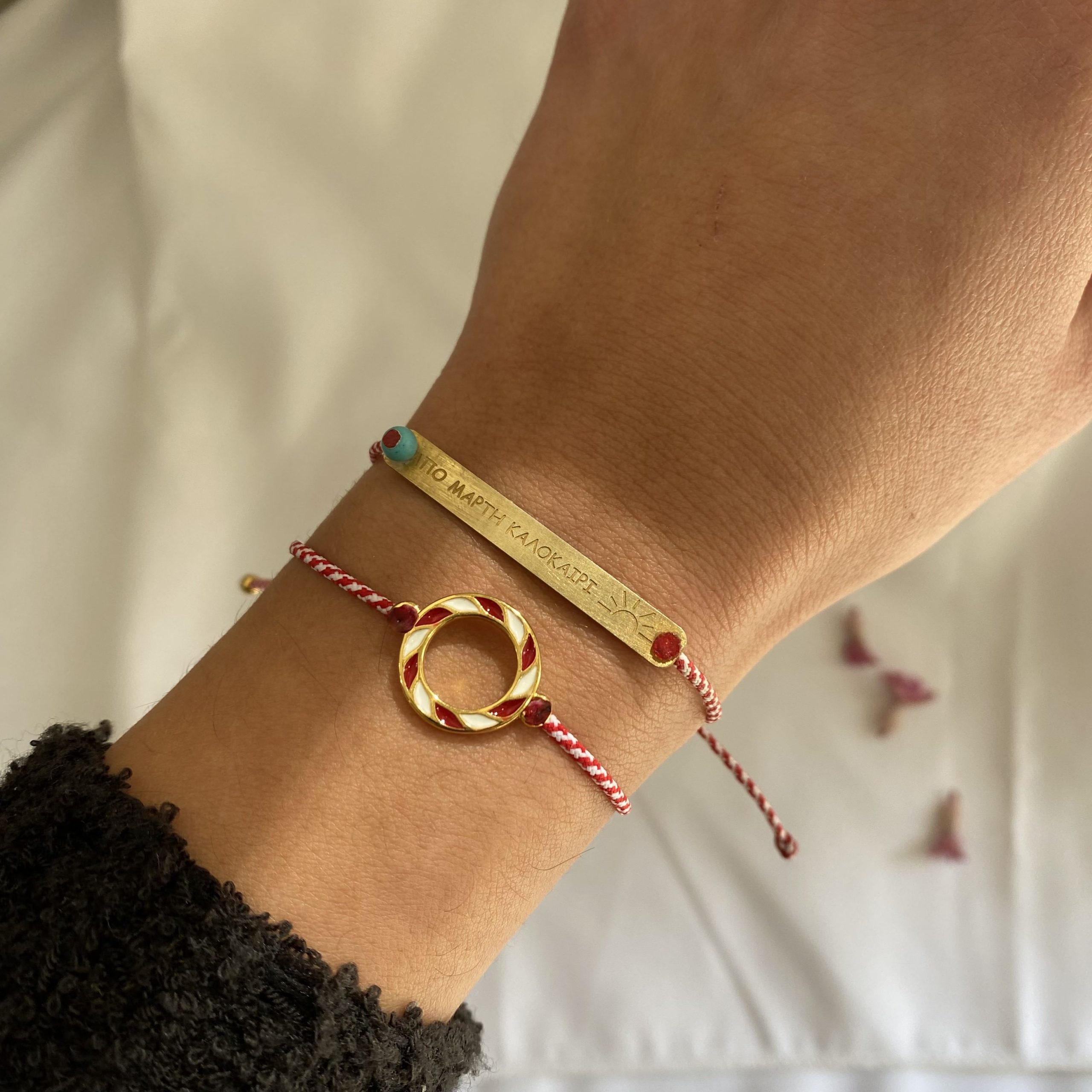 Χειροποίητο βραχιόλι για τον Μάρτη με στοιχείο από ορείχαλκο. Κούμπωμα μακραμέ ρυθμιζόμενο. Διάλεξε το μαρτάκι σου, για να προστατευτείς από τον ήλιο!