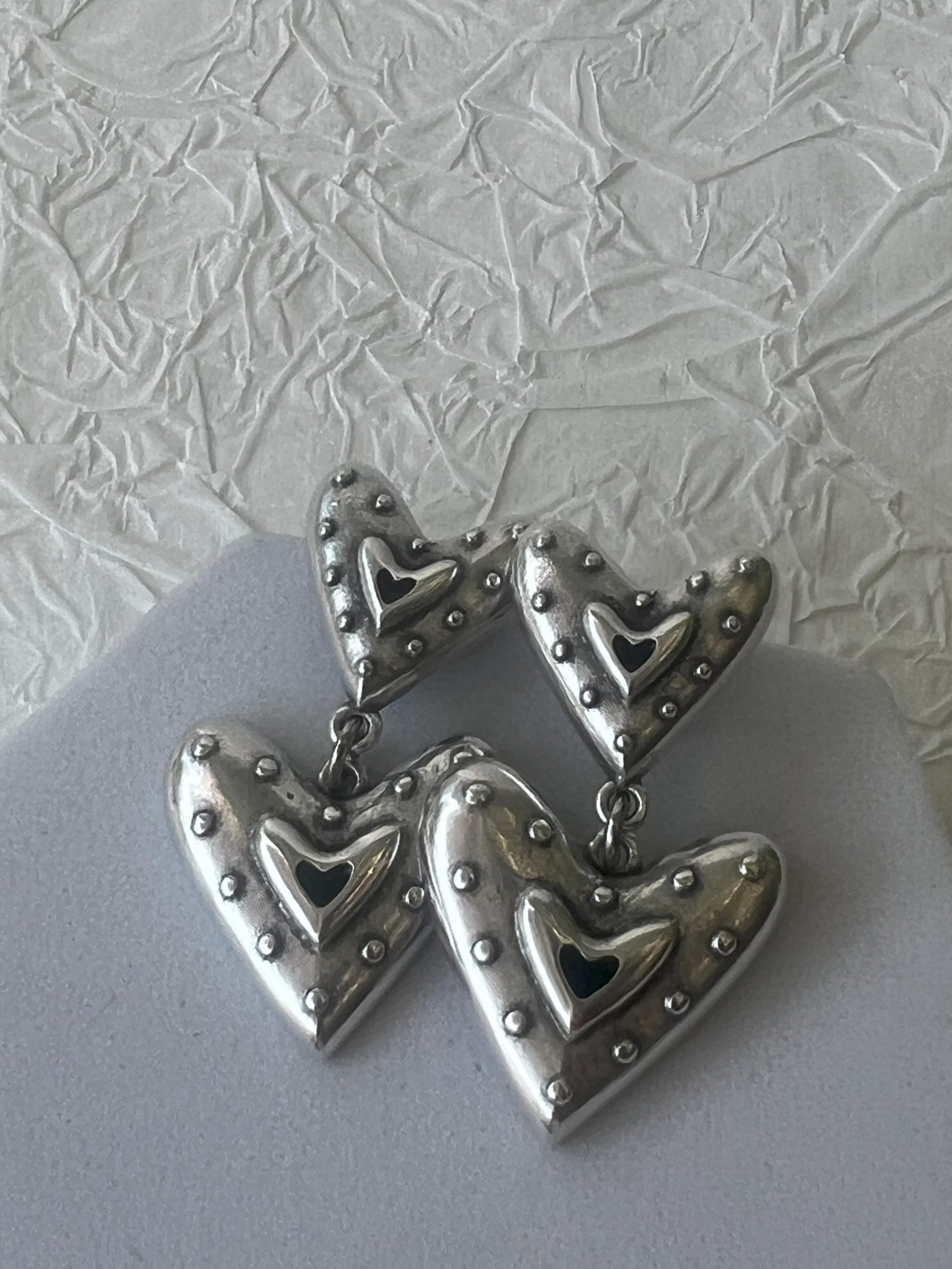 Χειροποίητο σκουλαρίκι με καρδιές, από ορείχαλκο και αντικέ ασημί επιμετάλλωση.