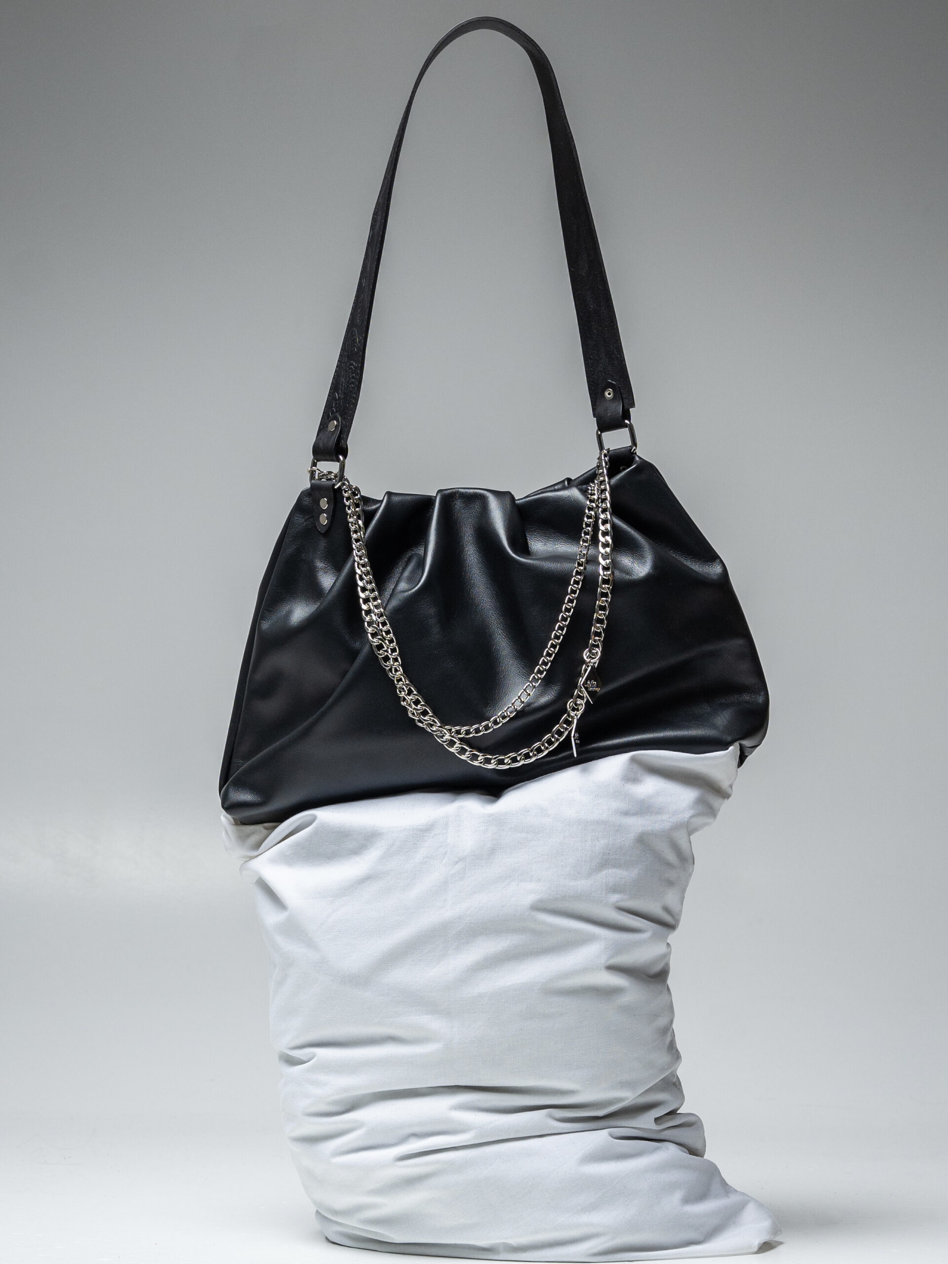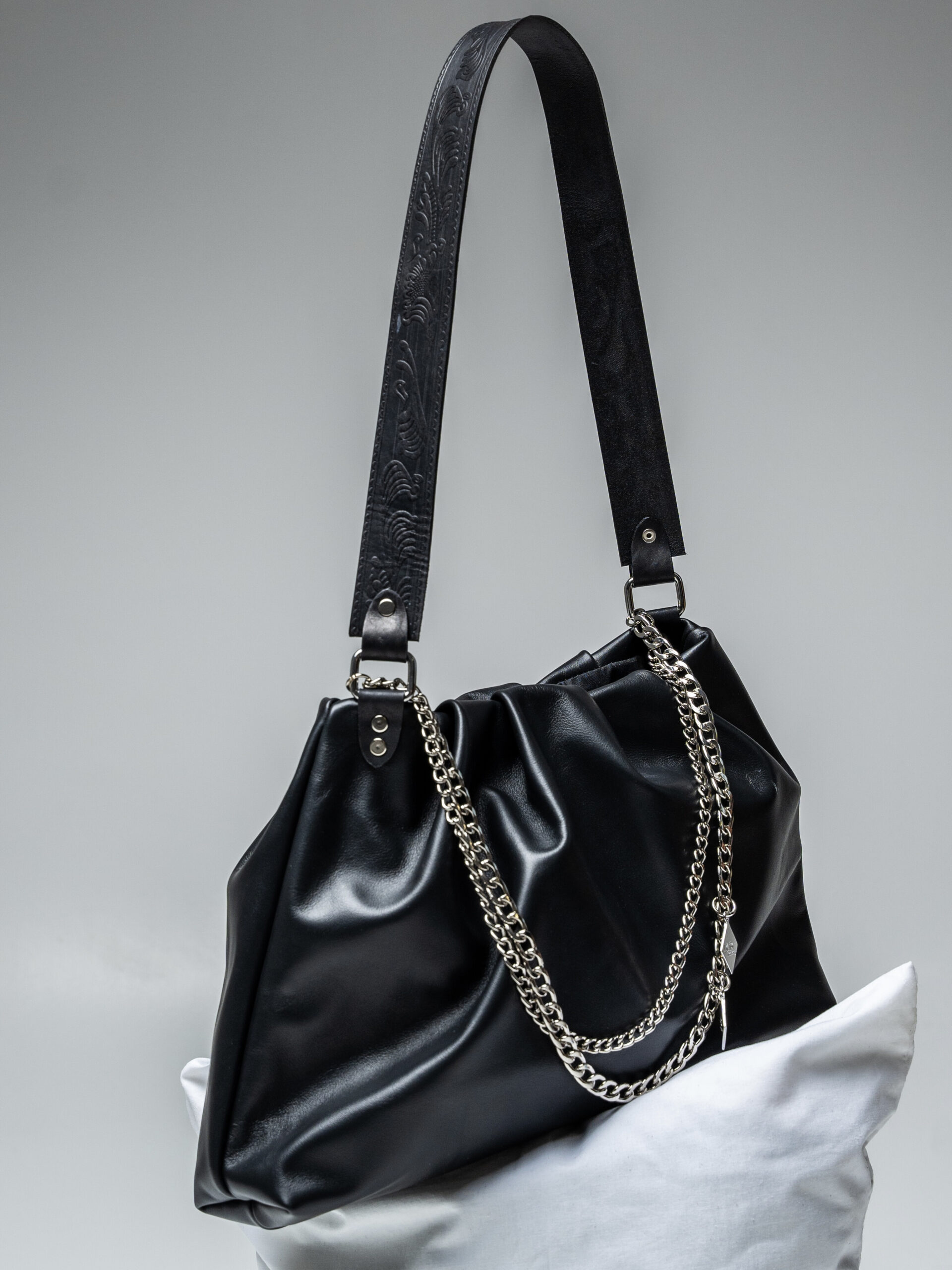 Χειροποίητη δερμάτινη τσάντα με σούρα στο πάνω μέρος.