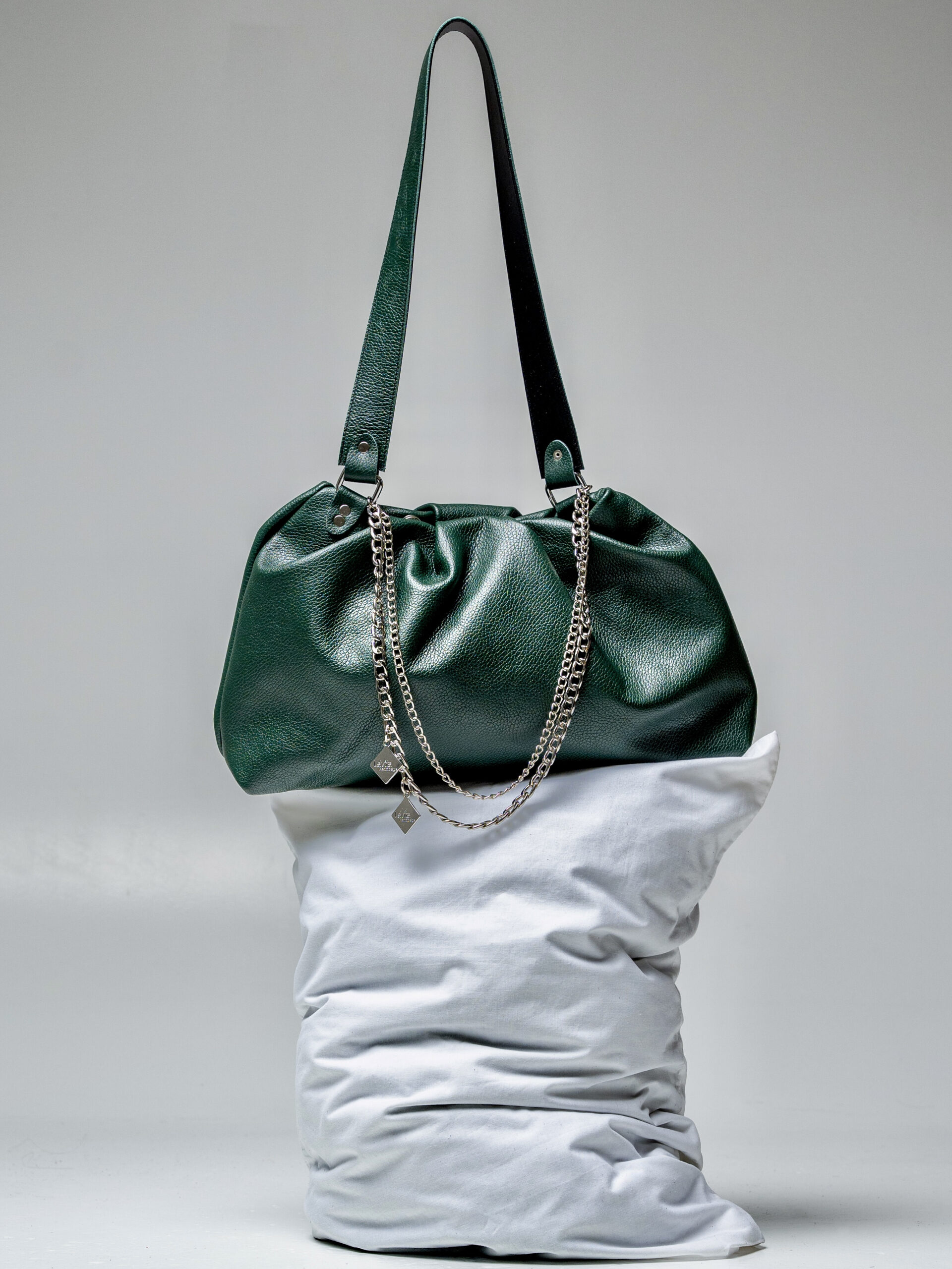 Χειροποίητη δερμάτινη τσάντα με σούρα στο πάνω μέρος.