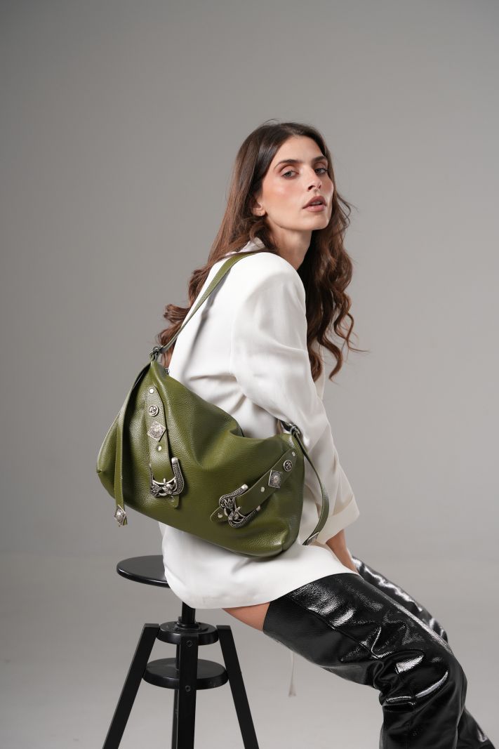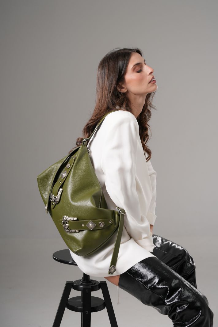 Δερμάτινη χειροποίητη τσάντα με μεταλλικά αξεσουάρ.