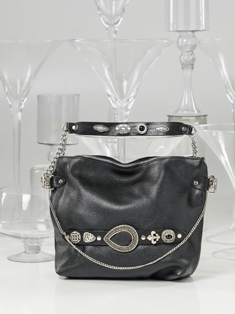 Δερμάτινη χειροποίητη τσάντα ώμου με μεταλλικό αξεσουάρ.