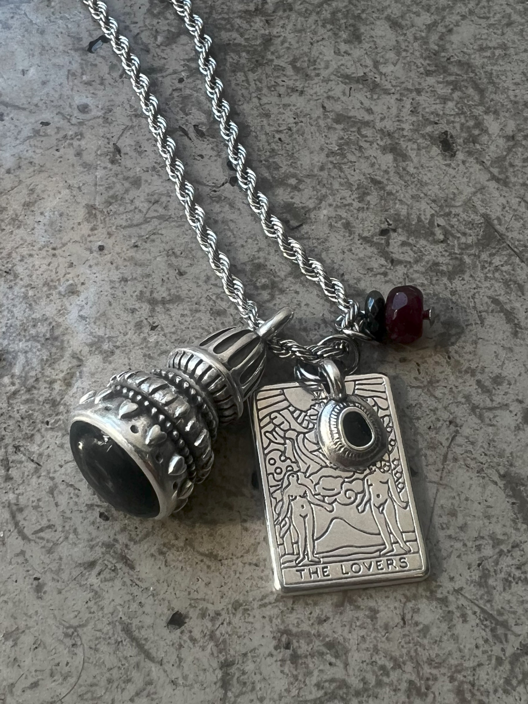 Χειροποίητο κολιέ με charms. Αλυσίδα ατσάλι και επάργυρα ορειχάλκινα στοιχεία και ημιπολύτιμοι λίθοι.