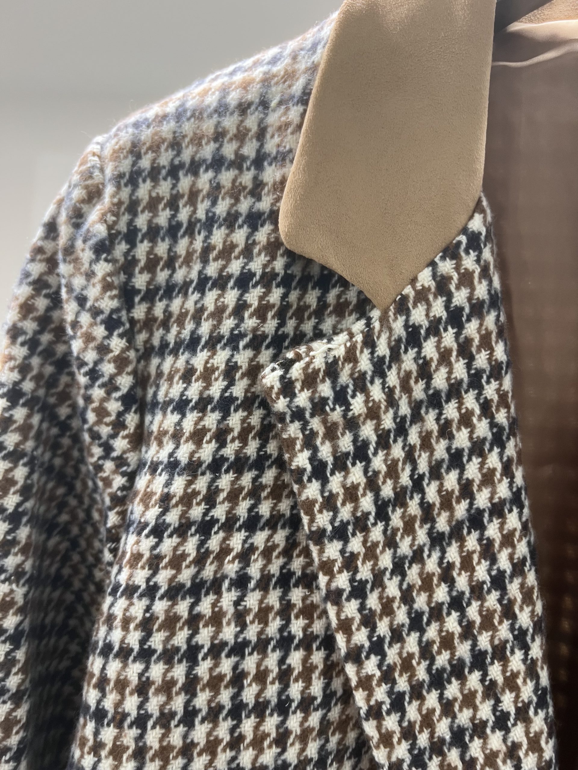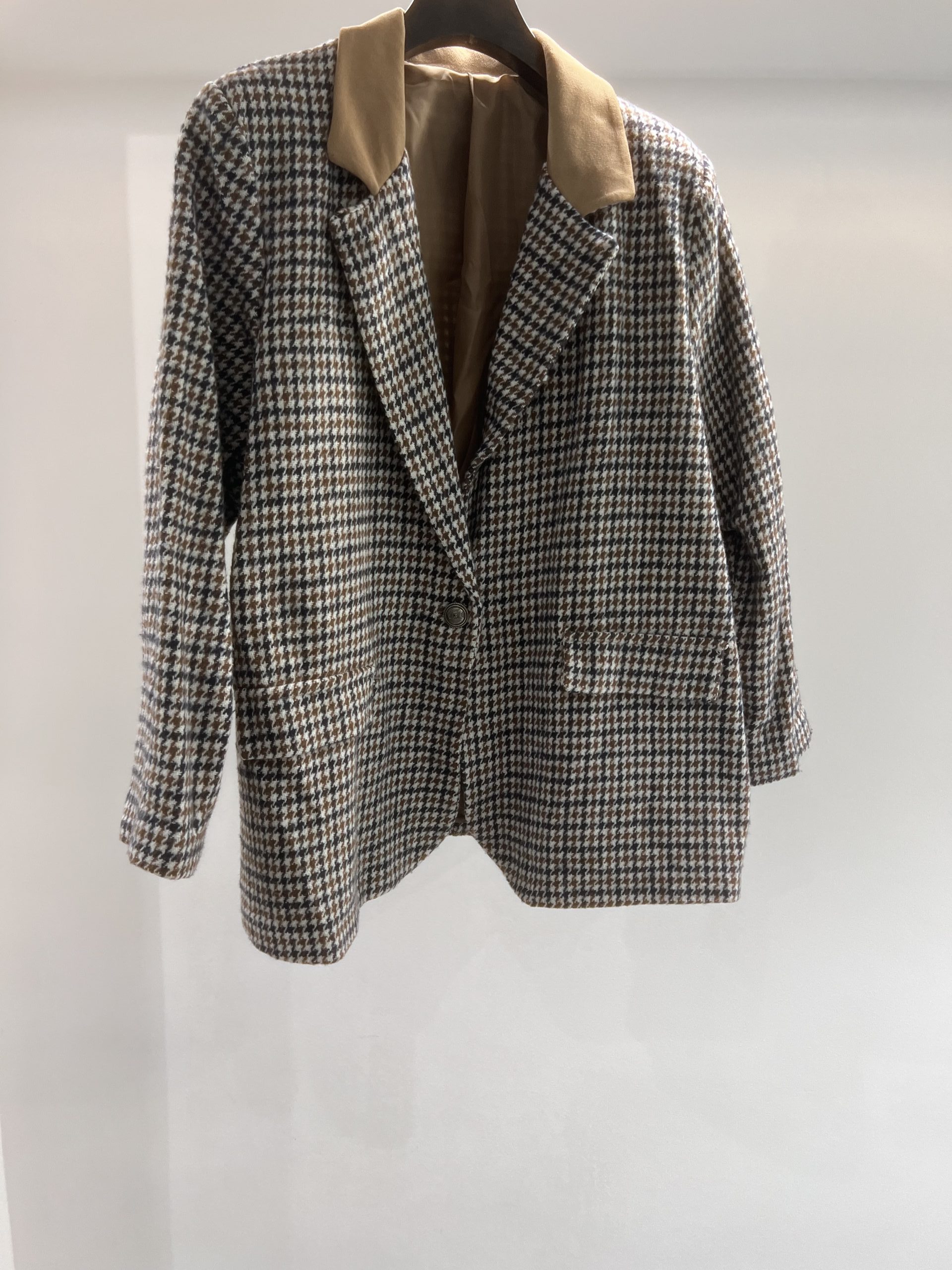 Σακάκι pied de poule σε αποχρώσει μπέζ καφέ μπλέ. Μεταλικό κουμπί. Σουέτ μπέζ γιακάς. ONE SIZE 100%Polyester
